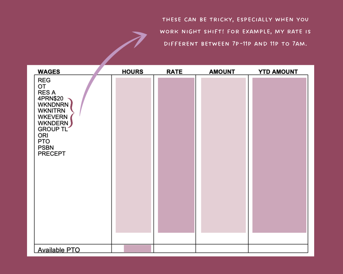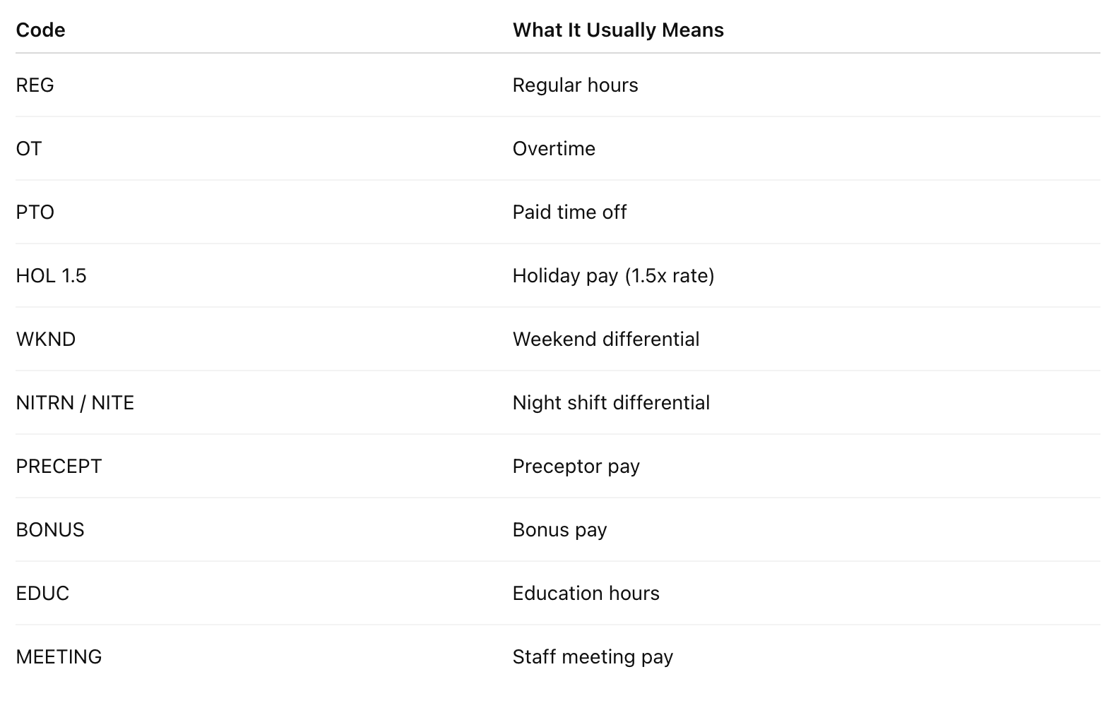 Hospitals often create their own internal abbreviations, so the exact codes may differ. The key point: You should know what every code on your paystub represents.