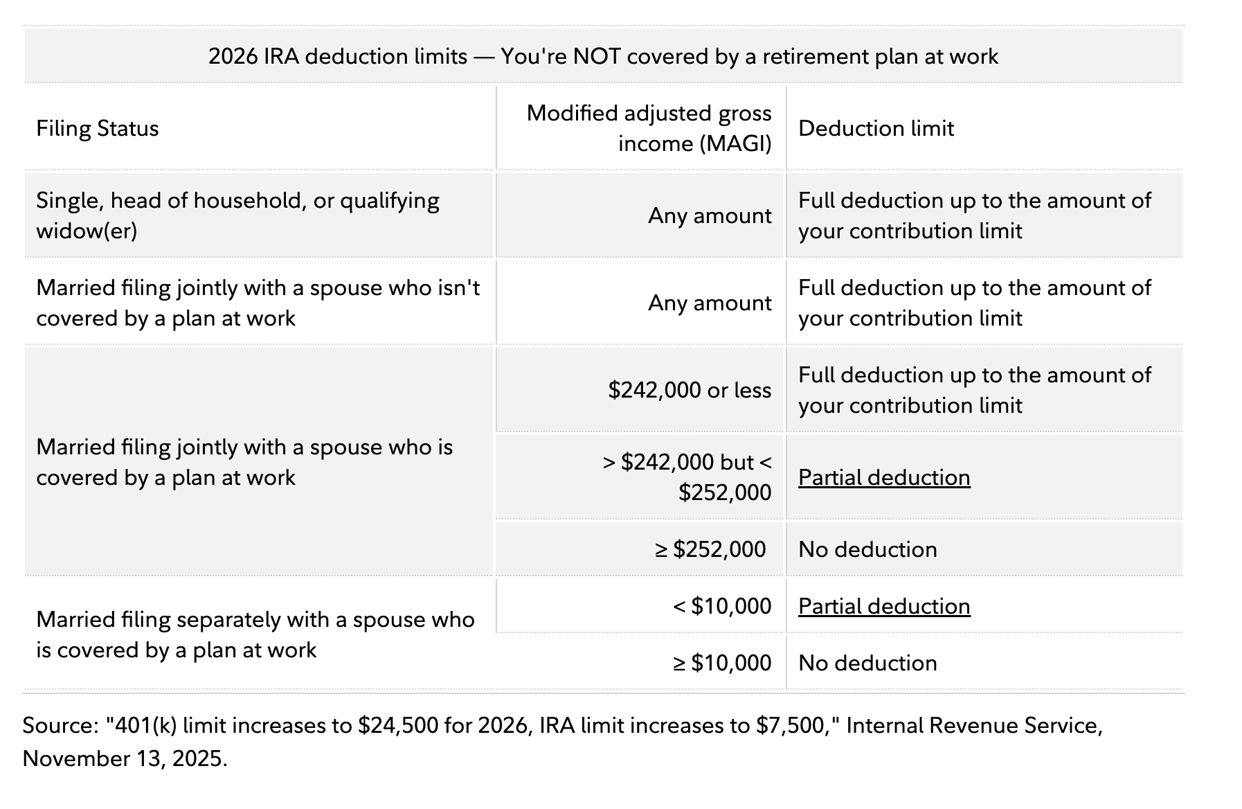 If you are covered by a plan at work, your ability to deduct your Traditional IRA contribution depends on your Modified Adjusted Gross Income (MAGI).